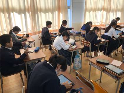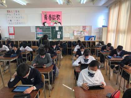 本日の7年生の取り組みです。タブレットを使用して全員でeライブラリをしました。
