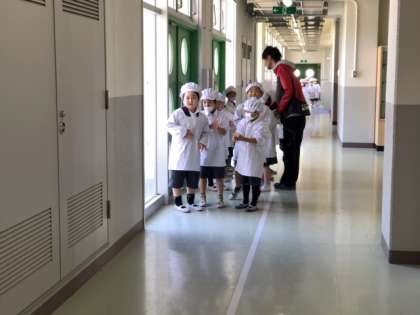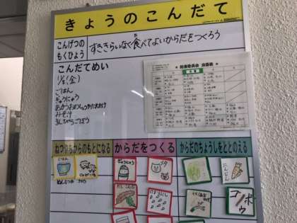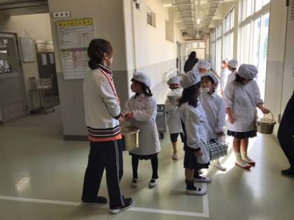 自分たちで質問して答えるところが可愛らしい、給食準備の風景です。
