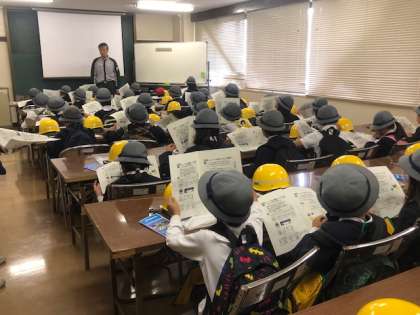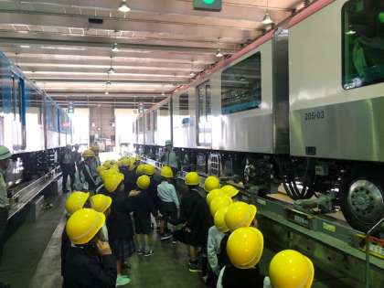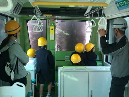 ?南港検車場では、ニュートラムの車両を間近で見せていただきました。タイヤも近くで見るととても大きくてびっくりしました。最後に車両に乗って洗車場へ。