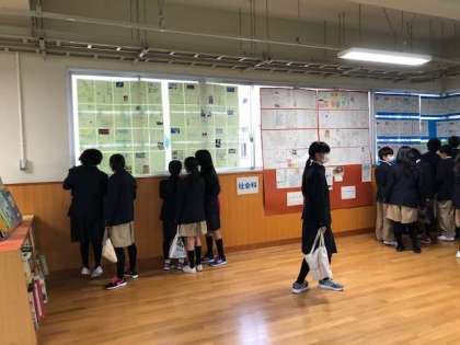 今日の午後、水都国際中学校の1年生が本校の作品展の見学に来られました。本校の中学生の作品に興味津々、お互い高め合えることができるように交流を増やしていきたいですね。
