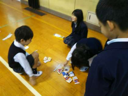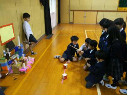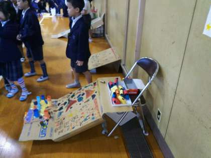 1年生を体育館に招待して、自分らで作ったおもちゃで遊んでもらいました。遊んでもらわなければ、いけないのに、ついつい遊んでいました。