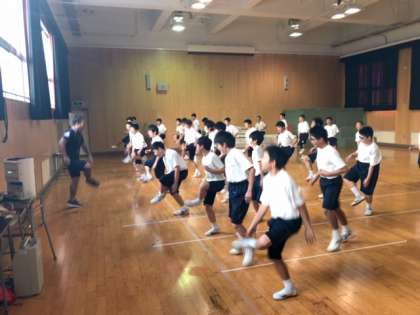 格技室では、7年生の体育の授業で、身体つくり運動が行われていました。