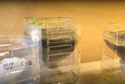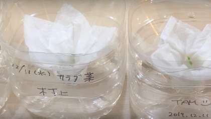 職員室に通じる廊下スペースの一角で、技術科の先生が水耕栽培で、サラダ菜やしろななどを育てています。もう芽が出て、こんな感じです。