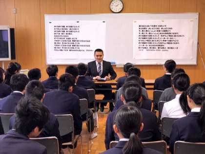 午後、8年生では、昨年も来ていただいた浜崎さんから、全盲の障がいをもち過ごしてきた学生時代のエピソードを話していただきました。