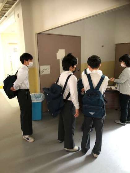 5月15日(金)、登校日4日目です。今日は3年生と8年生が対象です。中学生は熱心に手洗い・消毒を済ませて入室しました。3年生はソーシャルディスタンスに配慮して、先生からお話を聞きました。