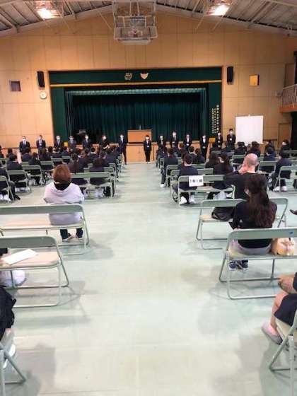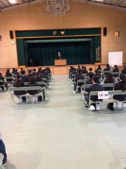 5月16日(土)、小雨の降る中、7年生76名の入学オリエンテーションが行われました。学校長挨拶に続いて、教職員紹介・各先生からの話がありました。