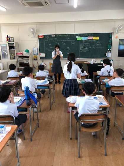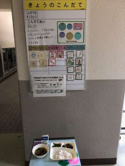 今日から通常給食がやっと始まりました。久しぶりにご飯がでたので、みんな大喜びでした。献立はごはん・牛乳・チンジャオニューロウスー・ハムと野菜の中華スープ・えだまめです。