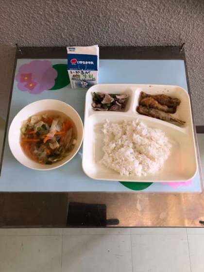 今日の献立はごはん・牛乳・いわしてんぷら・五目汁・豚肉とさんどまめのいためものでした。