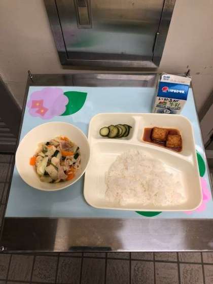 今日の献立はごはん・牛乳・中華煮・あつあげのピリ辛じょうゆかけ・きゅうりの中華あえでした。