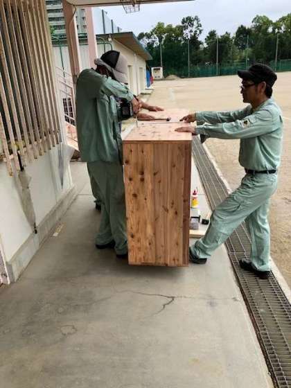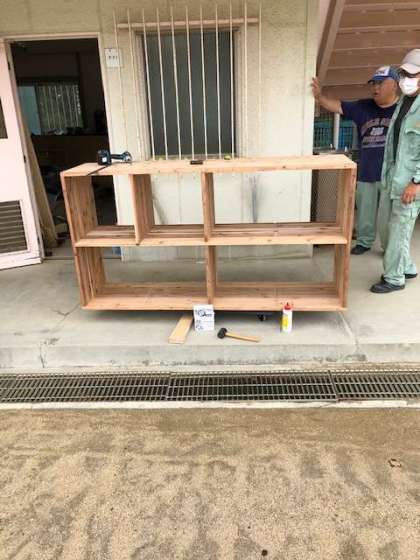 梅雨の合間をぬって、管理作業員さんが中学校美術の授業で使用する棚を作成してくれています。