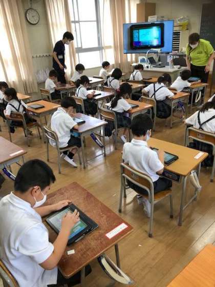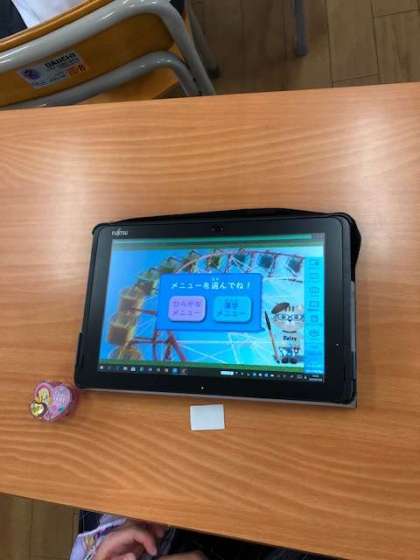 最初に担任の先生から、説明を受け、個人用IDをもらって、いよいよログインです。思ったより早く、全ての児童が無事ログインできた後は、少しの時間ですが、自由にタブレットを触っても良いことになりました。