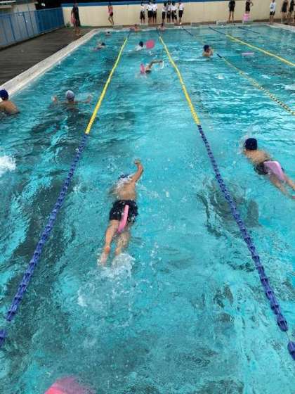 7年生の保健体育科の授業では、7月6日よりプール授業が始まっています。今日はビート板を使ったトレーニングを中心とする授業でした。曇り空でしたが、元気いっぱい取り組んでいました。