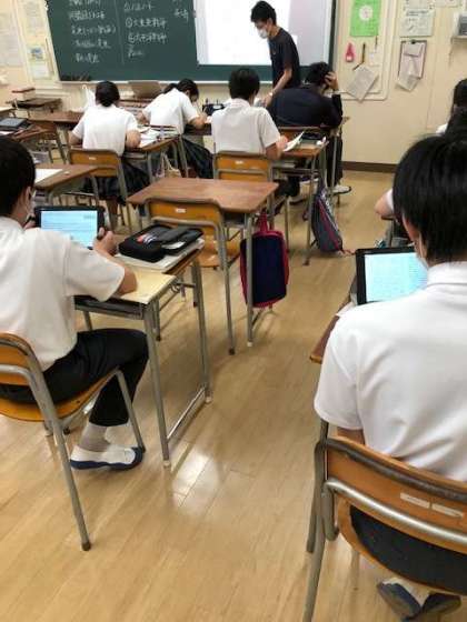 9年生の社会科では、授業で学んだ太平洋戦争に関して、各自タブレットを使った調べ学習を行っています。新聞形式にする生徒・レポート形式にする生徒などその形は様々ですが、みんな興味関心をもって取り組んでいました。