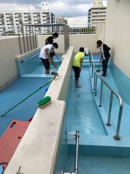 7月16日、小学校プールの清掃・準備を教職員で行いました。今年は、新型コロナウイルス感染症の影響で、小学校は5・6年生のみプール授業を行います。