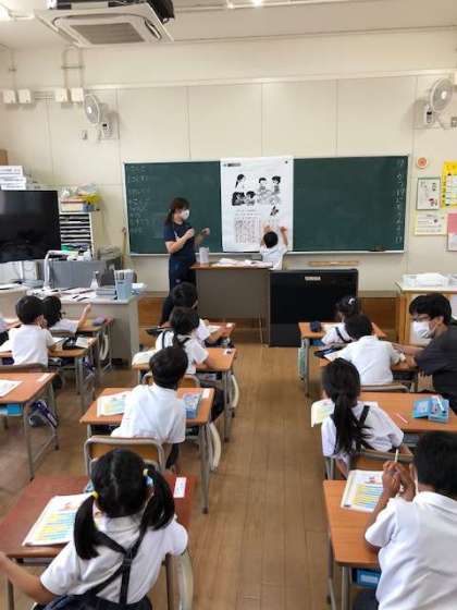 1年生はさんすうの授業です。図の中から足して10になる数字のペアを探す練習をしています。足し算の基本となる練習ですが、みんな楽しそうに取り組んでいました。