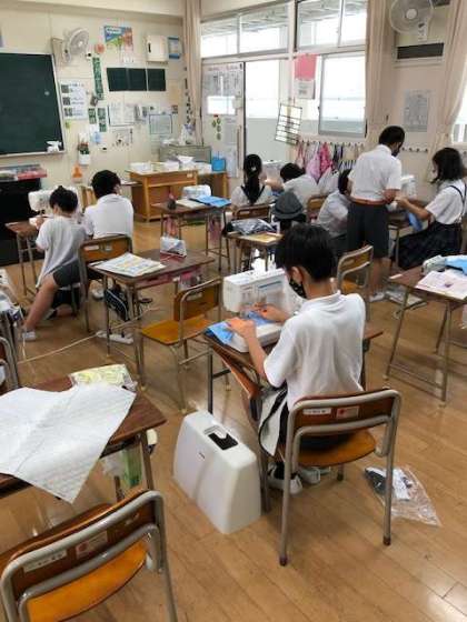 5年生は先日お知らせした家庭科のナップサックづくりの続きです。いよいよミシンの使用が始まりました。今回は練習もかねて、2人で一台のミシンを使っています。時々起こるトラブルを二人で力を合わせて解決しています。