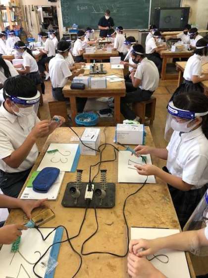 7月28日の授業の様子です。8年生は技術家庭科でラジオ作りを行っています。クーラーの利かない技術室、しかもマスクにフェイスシールド着用と大変暑い中での授業となりましたが、はんだごてを使った作業など、初めてのことが多く、暑さを忘れて作業に集中していました。