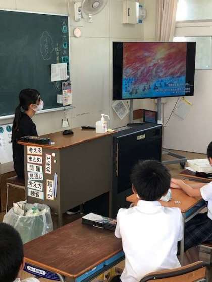 その後、各クラスで平和学習の取り組みを行いました。写真は4年生が「東京大空襲」について学習している様子です。