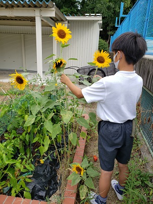 スマイル学級の学習園のヒマワリが大きくなりました。児童の背丈ぐらいにまで成長しました。
