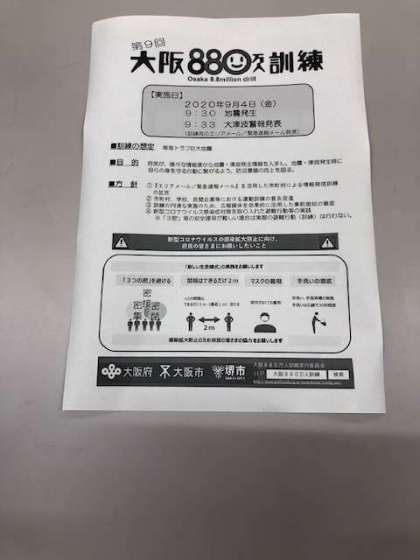 9月4日、朝に全校で大阪880万人訓練に参加しました。