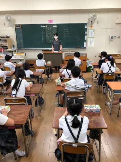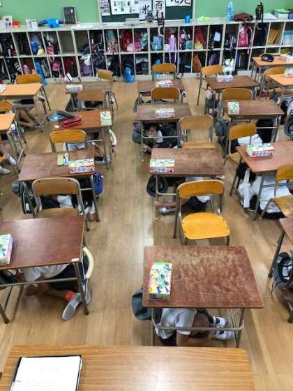 続いて、行政無線にそって教室内での避難訓練を行い、担任から地震があった時の注意点などの話がありました。