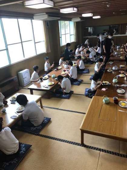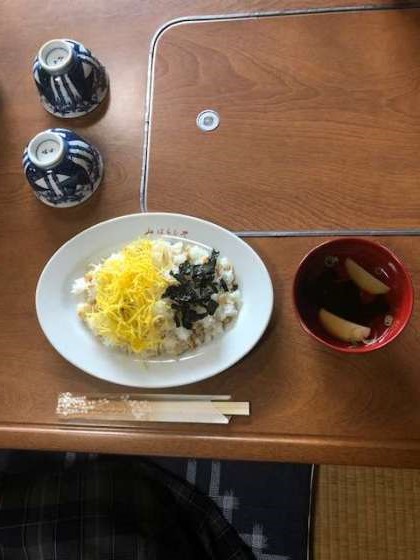 避難訓練を終え、昼食です。感染防止のため、席は対面にならないよう、工夫をしてくださいました。昼のメニューはちらし寿しです。「おいしい」と言いながら食べていました。