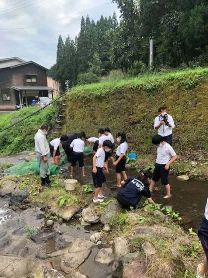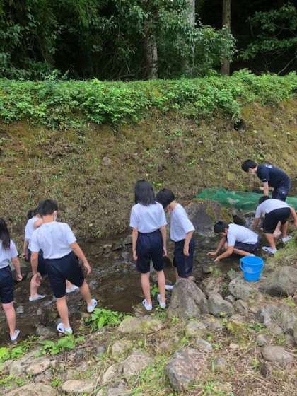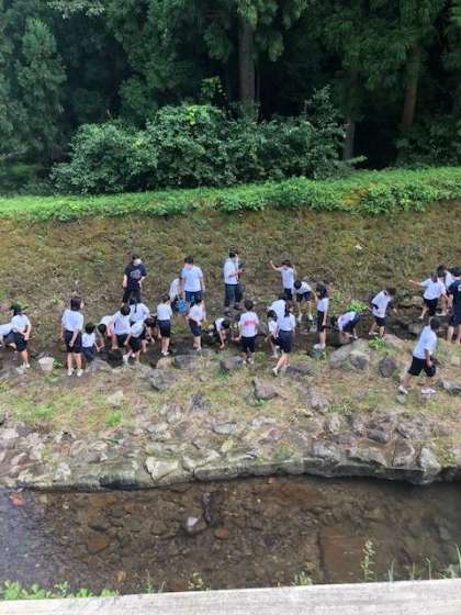 川にアマゴを放流してもらい、魚つかみをしました。大自然vs子どもたち。みんな必死で逃げる魚たちを追いかけ、悪戦苦闘の末、なんとか全員つかまえることができました。