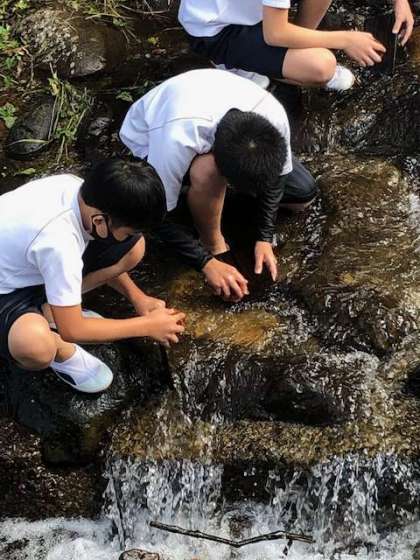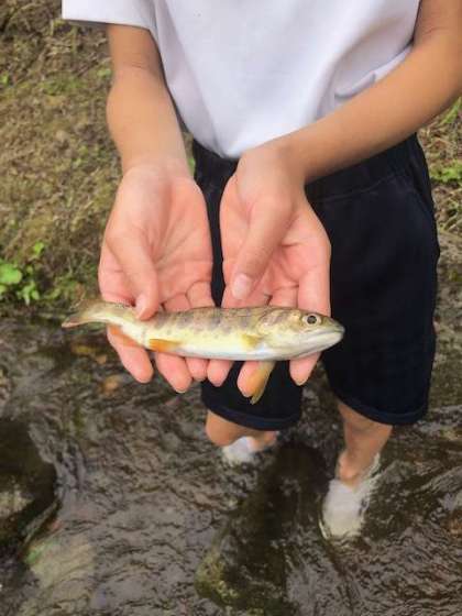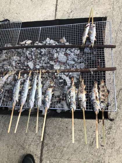 自分たちでとった魚を大自然の中で食べる!とてもおいしそうに食べていました。