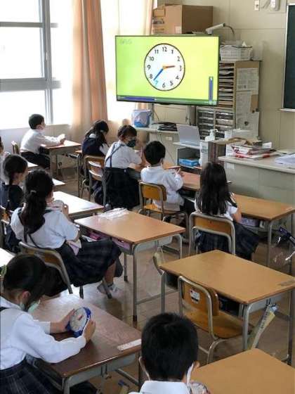 1年生が時計の読み方・合わせ方について学んでいます。今日は00分と30分の2種類だけでしたが、先生からだされた時刻に教具の時計を合わせていました。