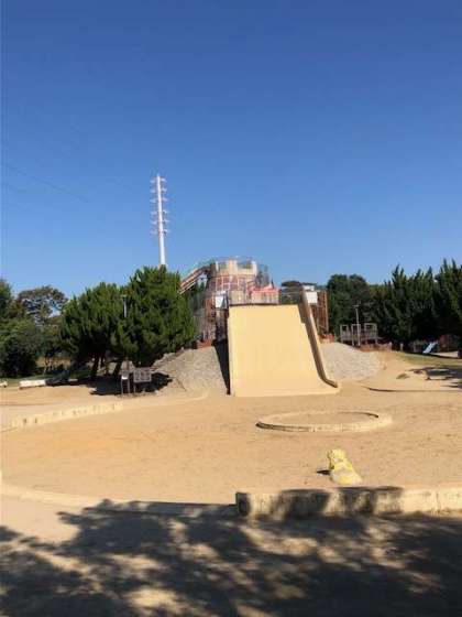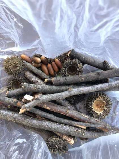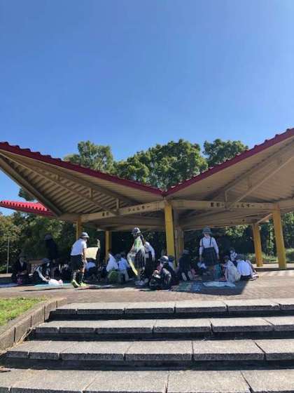 広場で、図工の作品作りに使うどんぐりや木の枝、落ち葉などを拾いました。今から待ちに待ったお昼ご飯です。食べた後は大型遊具で目一杯遊びます。