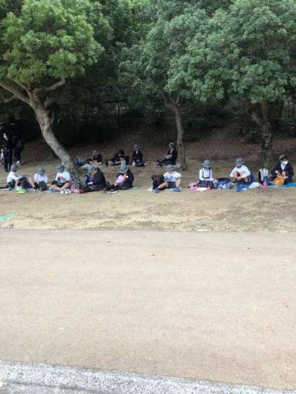 お弁当の時間です。コロナ対策で、横並びでお弁当を食べています。その後はお楽しみのおやつタイムです。