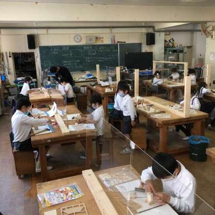 中学校の技術室で作業をしています。