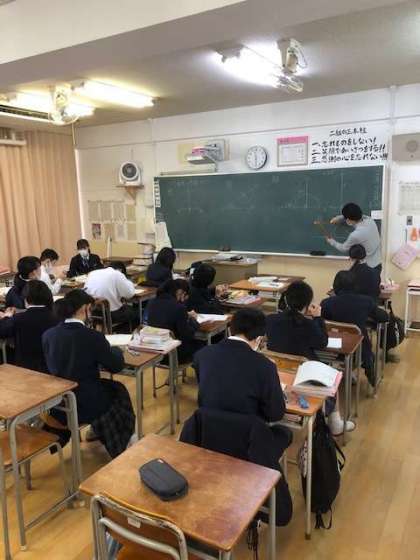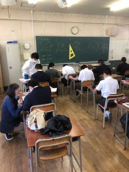 7年生数学の授業の様子です。内容はコンパスを使って垂直な線を作図するというものでした。
