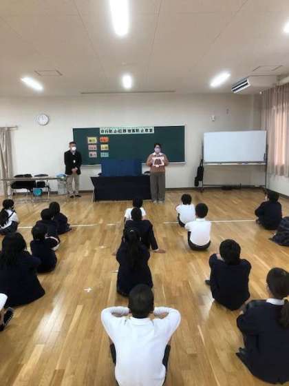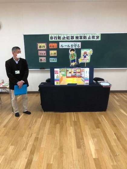 講師の先生から、「ルールを守る」というテーマで、飲酒やタバコ・暴力などの非行についての話があった後、人形劇で万引きの怖さについて学習しました。