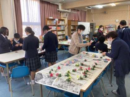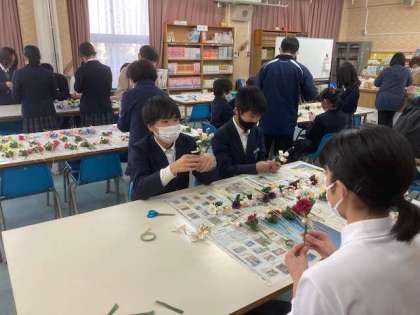 小中学校の卒業式に向けてコサージュ作りを行いました。6年生・9年生が卒業式に胸に飾るコサージュを児童会・生徒会のメンバー、地域の元気アップ指導員の皆様と有志の教職員で製作しました。