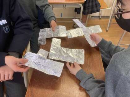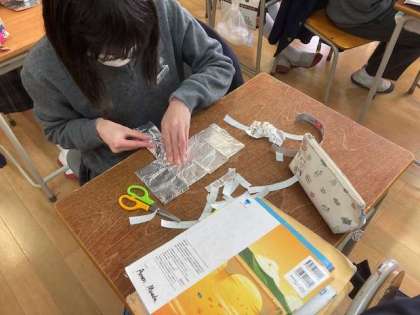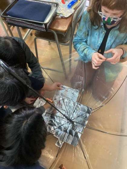 答えは英語の授業です。英語の教科書に「Cookinng with the Sun」という単元があります。これは、太陽光など自然エネルギーを使って料理をするというお話です。どうせなら、これに挑戦してみようということで、日本語をできるだけ使わず英語だけで料理道具作りに挑戦しました。