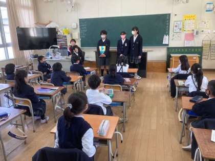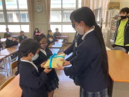 今回は先日の卒業を祝う会で各学年が6年生を歌やパフォーマンスで祝ってくれたお礼として、6年生が手作り雑巾を各学年に贈り返しました。