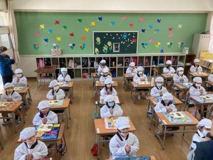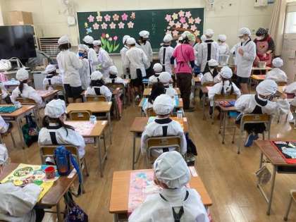 なんと、6年生が手伝ってくれました。まだまだ慣れていない1年生を助けようと、6年生が1年生の教室で全ての配膳をしてくれました。