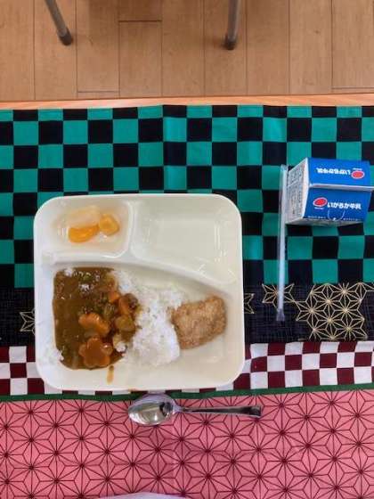 今日のメニューはカツカレーにフルーツ白玉の入学お祝い献立でした。