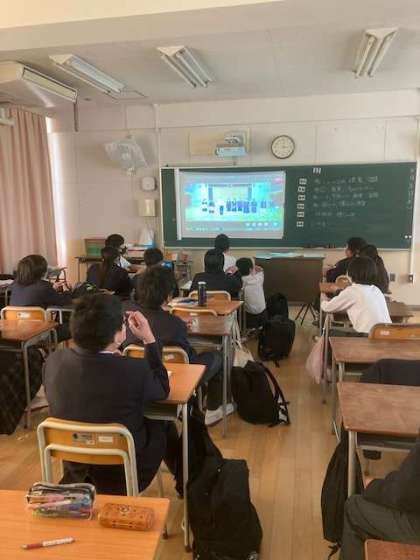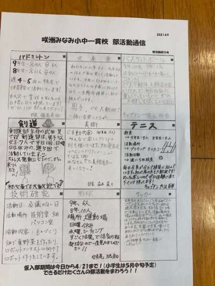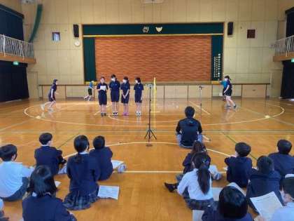 4月9日6限目、5年生〜9年生が部活動紹介を行いました。蜜を避けるため、5年生〜7年生は体育館で、8・9年生は各クラスでのオンライン中継で、各部の紹介を真剣に見ていました。