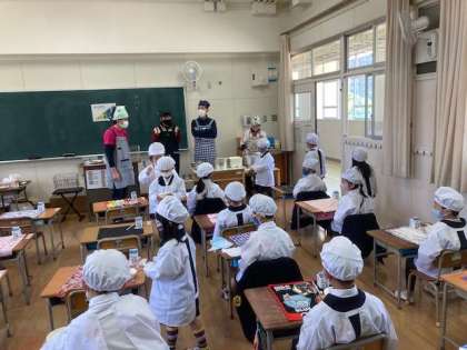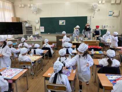 今日から1年生が自分たちで給食の配膳を行うようになりました。先週までは6年生に手伝ってもらっていたのですが・・・