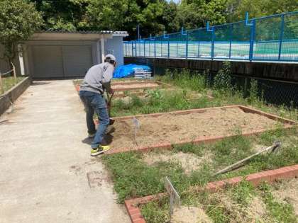 小学校学習園では、理科補助員さんによる整備が進んでいます。土を返したり、畝を作ったりして頂いてます。