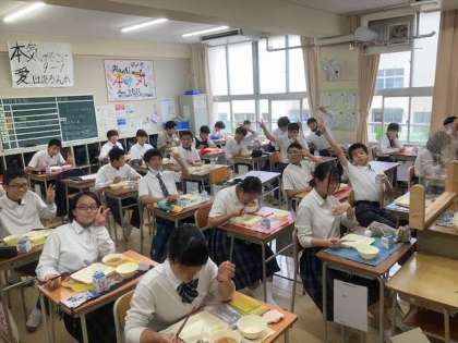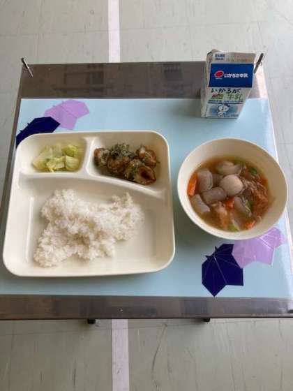 5月18日、本日の給食の献立は米飯・牛乳・ちくわのいそべあげ・あつあげとさといもの煮もの・あっさりキャベツでした。