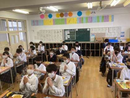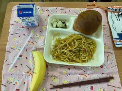 5月21日、本日の給食の献立は黒糖パン・牛乳・カレースパゲッティ・キャベツのひじきドレッシング・バナナでした。