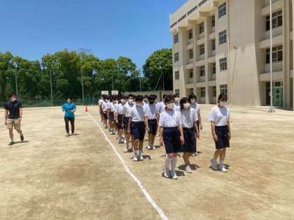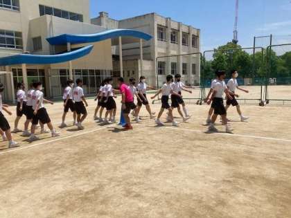 6月24日(木)に開催予定の中学校体育大会の練習がいよいよ始まりました。写真は9年生の行進の練習の模様です。