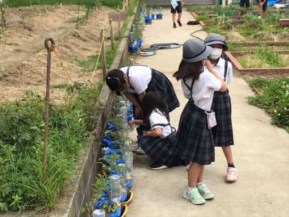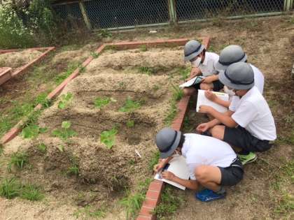 学習園で、自分たちが栽培している植物観察や水やりをしています。