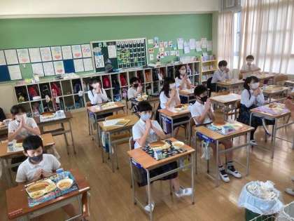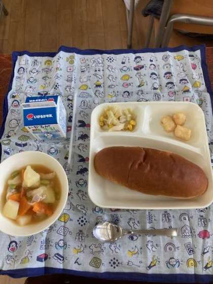 6月2日の給食の様子です。今日の献立は黒糖パン・牛乳・いかてんぷら・フレッシュトマトのスープ煮・サワーソテーでした。
