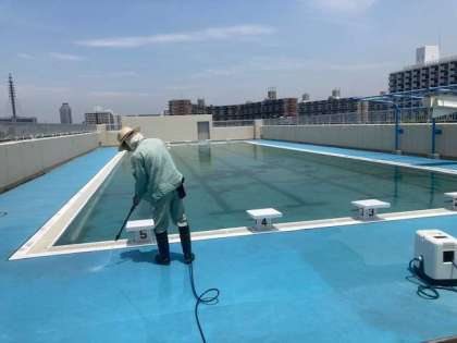 今日は管理作業員さんにプールサイドを丁寧に掃除していただきました。