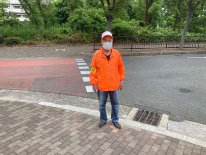 谷口さんは毎朝おなじみのオレンジ色のジャンパーを纏い、通用門南側の三叉路に立って、本校児童生徒を交通事故から守ってくれています。