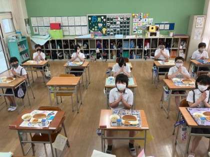 今日の献立は黒糖パン・牛乳・えびのチリソース・中華スープ・和なしでした。